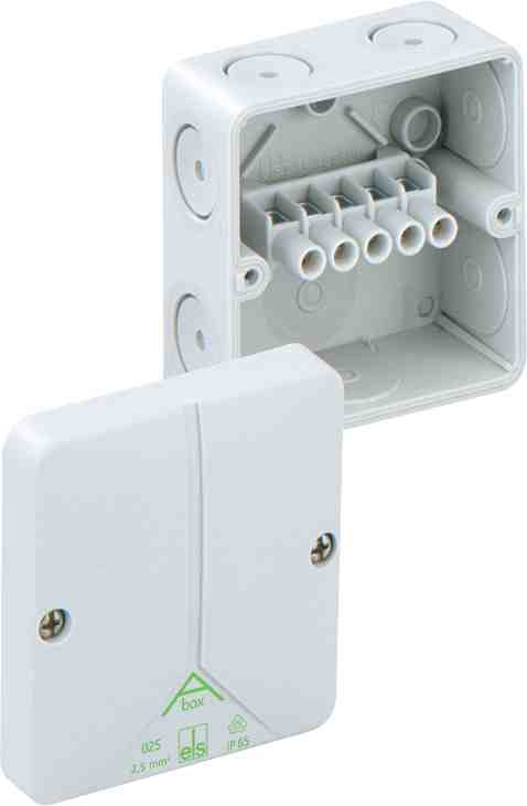 Rozbočovací krabice, se stupněm krytí IP65, Jmenovitý průřez 2,5 mm?, Ui=690V AC, Certifikováno VDE (DIN EN 60670-1/-22 (VDE 0606-1/-22)), Samotěsnicí měkká přívodní membrána, M20, Rozsah těsnění 2 - 16 mm, (1 Zpětné, 7 bočně), Vnitřní místa pro připevnění, pro standardní instalace ve vnitřním prostoru, šedá, s šroubovou svorkou, 5-pólovou - 2,5 mm? (4 x 1,5? / 4 x 2,5?) Rozměry: 80 x 80 x 52 mm