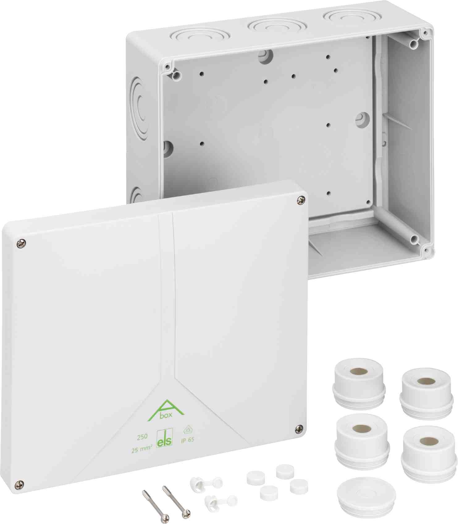 Rozbočovací krabice, se stupněm krytí IP54/IP65, Jmenovitý průřez 25 mm?, Ui=690V AC, Certifikováno VDE (DIN EN 60670-1/-22 (VDE 0606-1/-22)), Vyrážecí membrány, M20/M25/M32/M40/M50, (4 Zpětné, 10 bočně), Vnitřní místa pro připevnění, pro standardní instalace ve vnitřním prostoru, šedá, bez svorek Rozměry: 250 x 200 x 115 mm Přiložené příslušenství: 4 Vývodka IP54 M40 Rozsah těsnění 17 - 30 mm, 1 Zaslepovací zátky M40, 1 Plombovací souprava