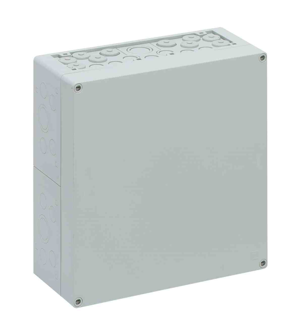 Prázdná skříň, se stupněm krytí IP65, polykarbonát, Ui=690V AC, Ui=1000V DC, Vnitřní místa pro připevnění, pro instalace v průmyslovém prostředí a chráněném venkovním prostředí, Krabice: polykarbonát, Víko: polykarbonát, zesílený skelnými vlákny, šedá, Vyrážecí membrány, M20/M25/M32/M40, (56 bočně) Rozměry: 300 x 300 x 132 mm Přiložené příslušenství: 10Dvojitá membránová vývodka IP66 M20 Rozsah těsnění 7 - 12 mm, 2 Dvojitá membránová vývodka IP66 M25 Rozsah těsnění 9 - 16 mm, 2 Dvojitá membránová vývodka M32 Rozsah těsnění 14 - 21 mm, 1 Dvojitá membránová vývodka IP66 M40 Rozsah těsnění 19 - 28 mm