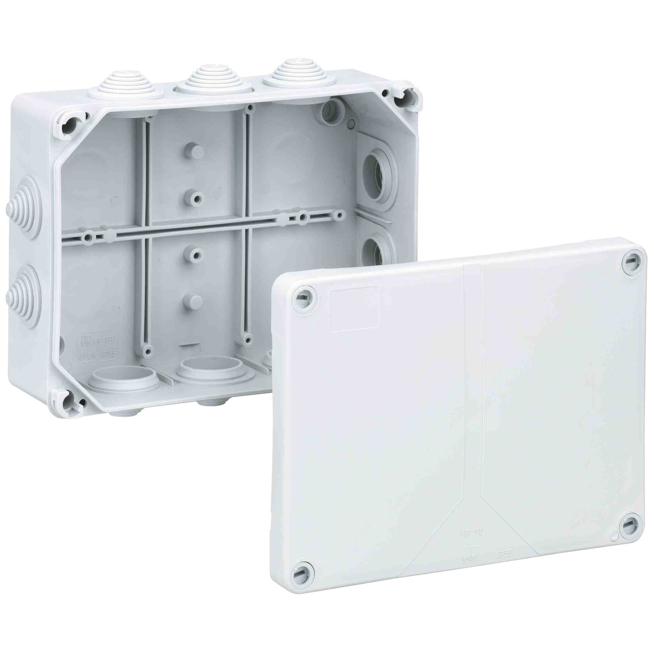Rozbočovací krabice, se stupněm krytí IP55, Jmenovitý průřez 16 mm?, Ui=690V AC, Certifikováno VDE (DIN EN 60670-1/-22 (VDE 0606-1/-22)), Stupňovitá vývodka, M25/M32/M40, Rozsah těsnění 13 - 26,5 mm, (4 Zpětné, 10 bočně), Vnitřní místa pro připevnění, pro standardní instalace ve vnitřním prostoru, šedá, bez svorek Rozměry: 199 x 149 x 77 mm