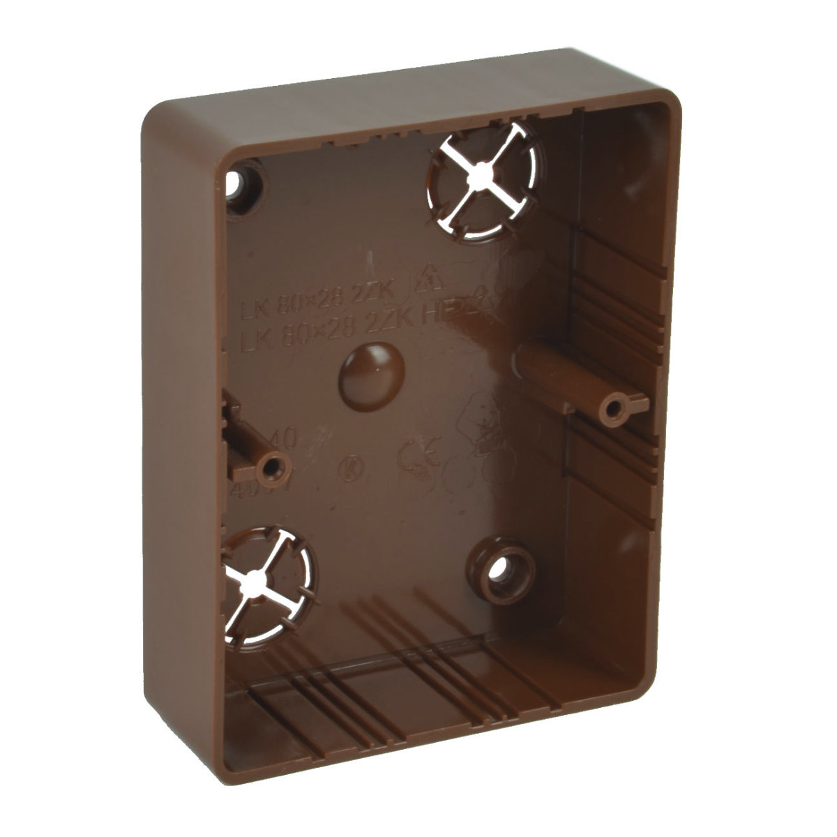 LK 80X28 2ZK - KRABICE LIŠTOVÁ, konfigurace I2, barva IMITACE/DUB TMAVÝ, balení - 10/80 ks  -  určené pro dvouzásuvky modelové řady Classic nebo Swing, pro instalaci na materiály třídy reakce na oheň E nebo F použijte izolační podložku, odstín pro instalace k lištám v odstínu I2 a TD