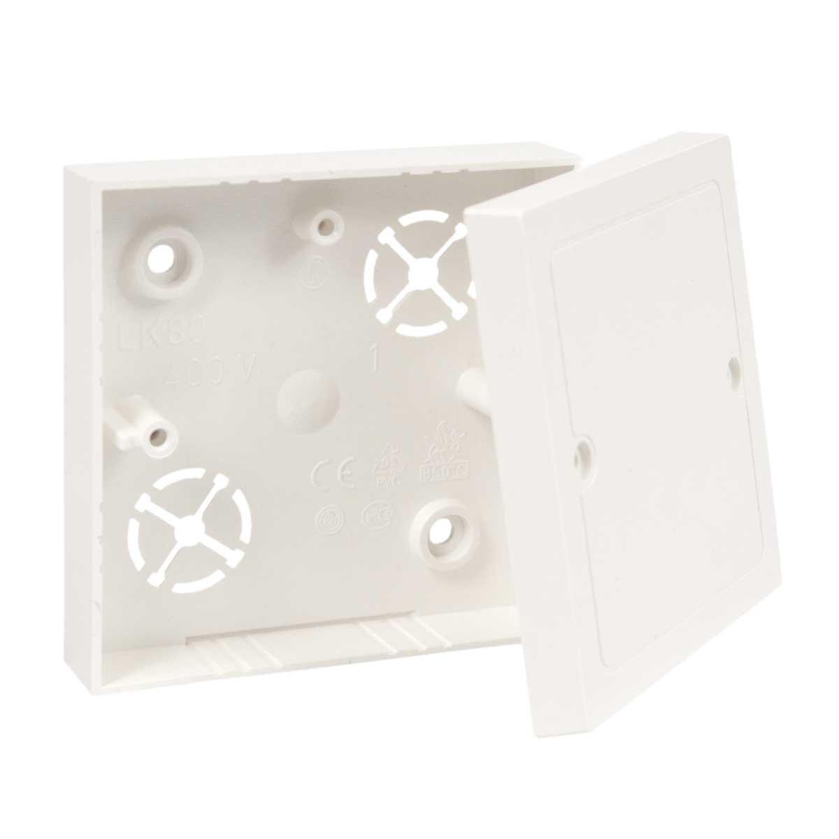 LK 80/2 - KRABICE LIŠTOVÁ, konfigurace HB, barva SUPERBÍLÁ/RAL9004, balení - 10/120 ks  -  pro opravy starších instalací, vložení svorkovnice S-66, víčko možno zakoupit samostatně. Pro instalaci na materiály třídy reakce na oheň E nebo F použijte izolační podložku.
