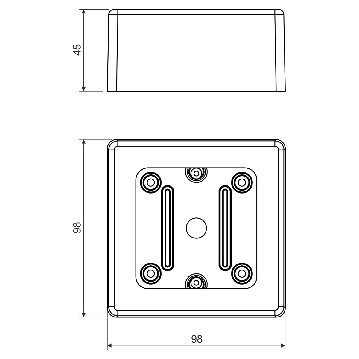 LKM 45 - KRABICE LIŠTOVÁ UNIVERZÁL, konfigurace HB, barva SUPERBÍLÁ/RAL9003, balení - 10/120 ks  -  univerzální krabice pro většinu jednonásodných přístrojů dostupných na trhu, na boční straně přednaznačen otvor pro vstup lišt do rozměru 40x20 mm včetně, krabice se skládá ze dvou částí, vrchního a spodního díli