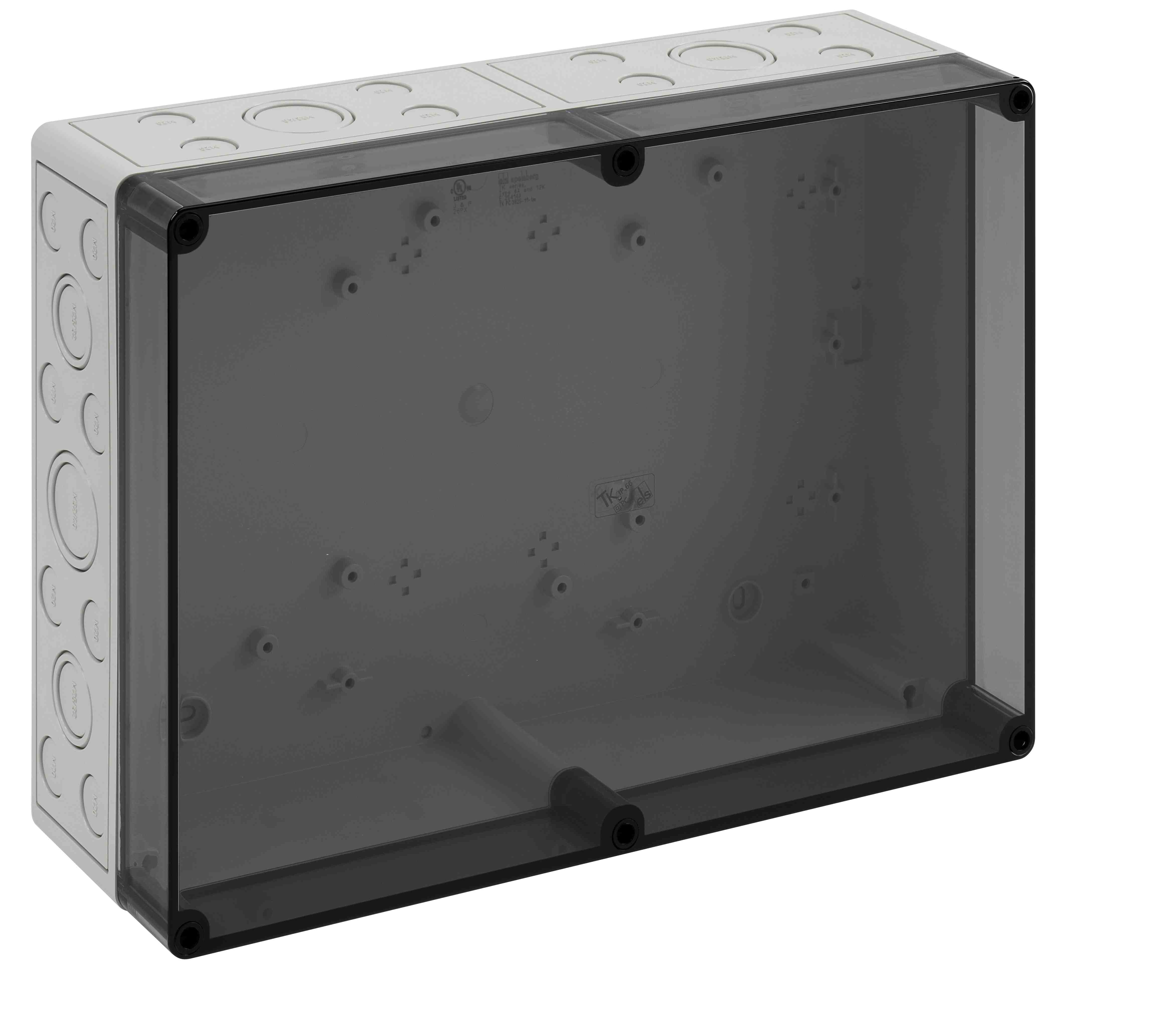 Prázdná skříň, se stupněm krytí IP66, polykarbonát, Certifikováno UL (UL 50 & CSA 22.2 No. 94.1-07, UL 50E & CSA C22.2 No. 94.2-07), DLG (odolnost vůči čpavku), DNV (Třída: Lodě & offshore zařízení), Ui=690V AC, Ui=1000V DC, Vnitřní místa pro připevnění, pro instalace v průmyslovém prostředí a chráněném venkovním prostředí, Krabice: polykarbonát, šedá, Víko: polykarbonát, transparenti, Vyrážecí membrány, M20/M25/M32/M40, (42 bočně) Rozměry: 361 x 254 x 111 mm