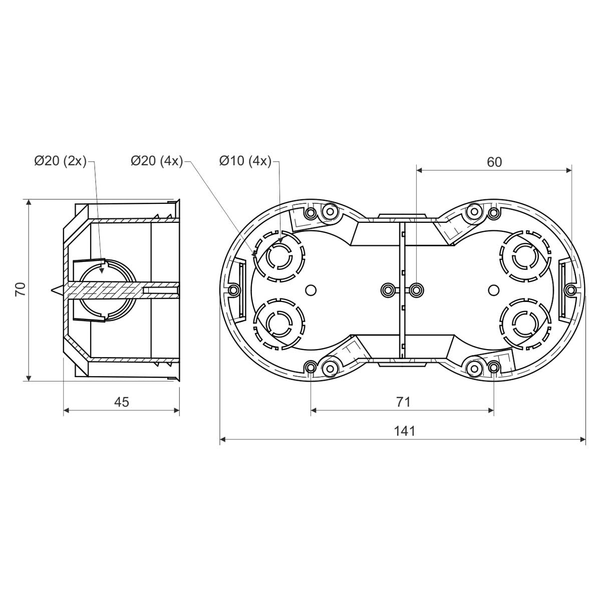 KP 64/2 - KRABICE PŘÍSTROJOVÁ, konfigurace KA, barva ŠEDÁ, balení - 2/50 ks  -  pro moderní instalace ve sdružených rámečcích,výrazná tuhost zjednodušuje instalaci přístrojů,