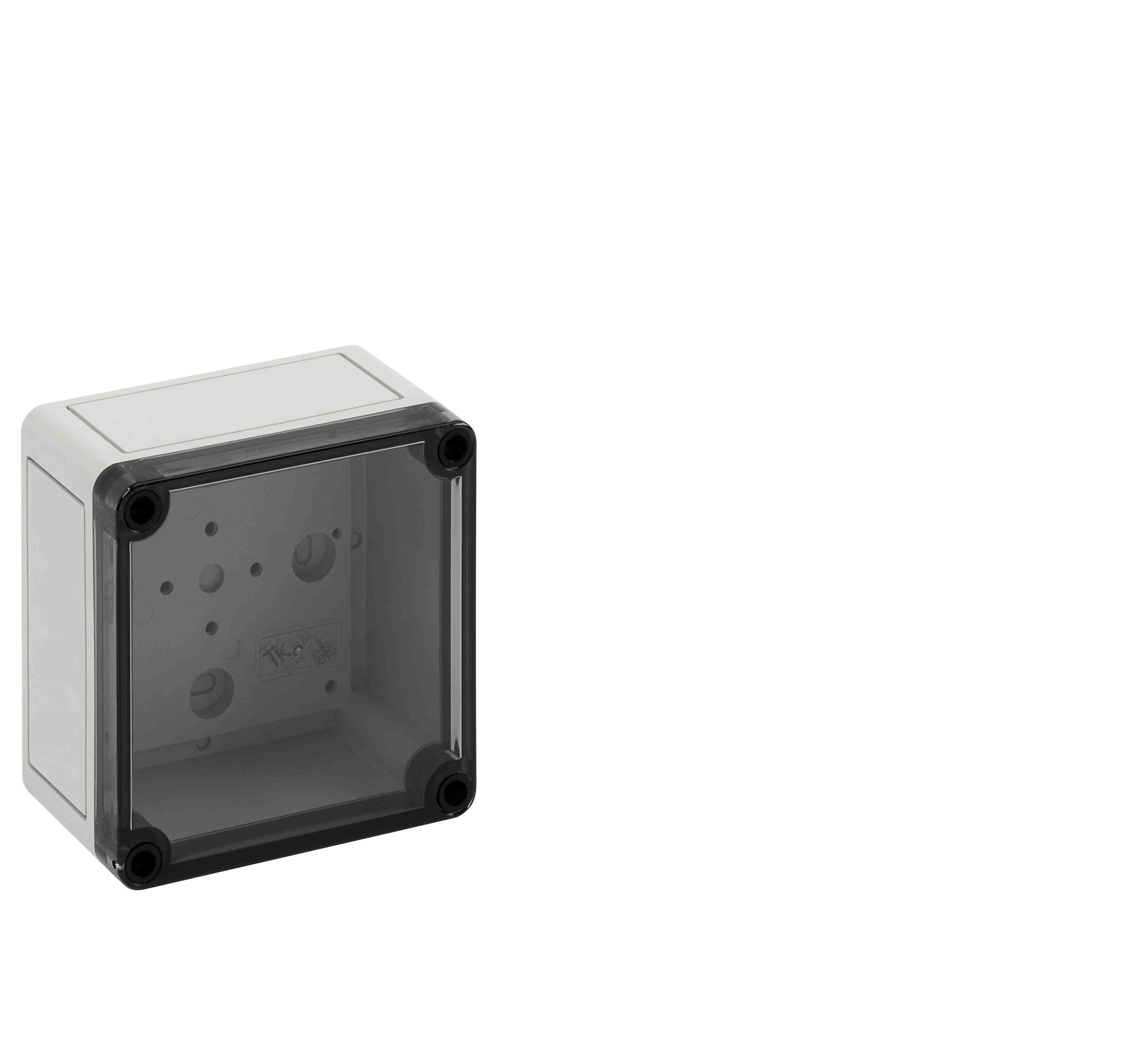Prázdná skříň, se stupněm krytí IP66, polystyren, Ui=690V AC, Ui=1000V DC, Vnitřní místa pro připevnění, pro standardní instalace ve vnitřním prostoru, Krabice: polystyren, šedá, Víko: polykarbonát, transparenti, hladké boky Rozměry: 110 x 110 x 66 mm