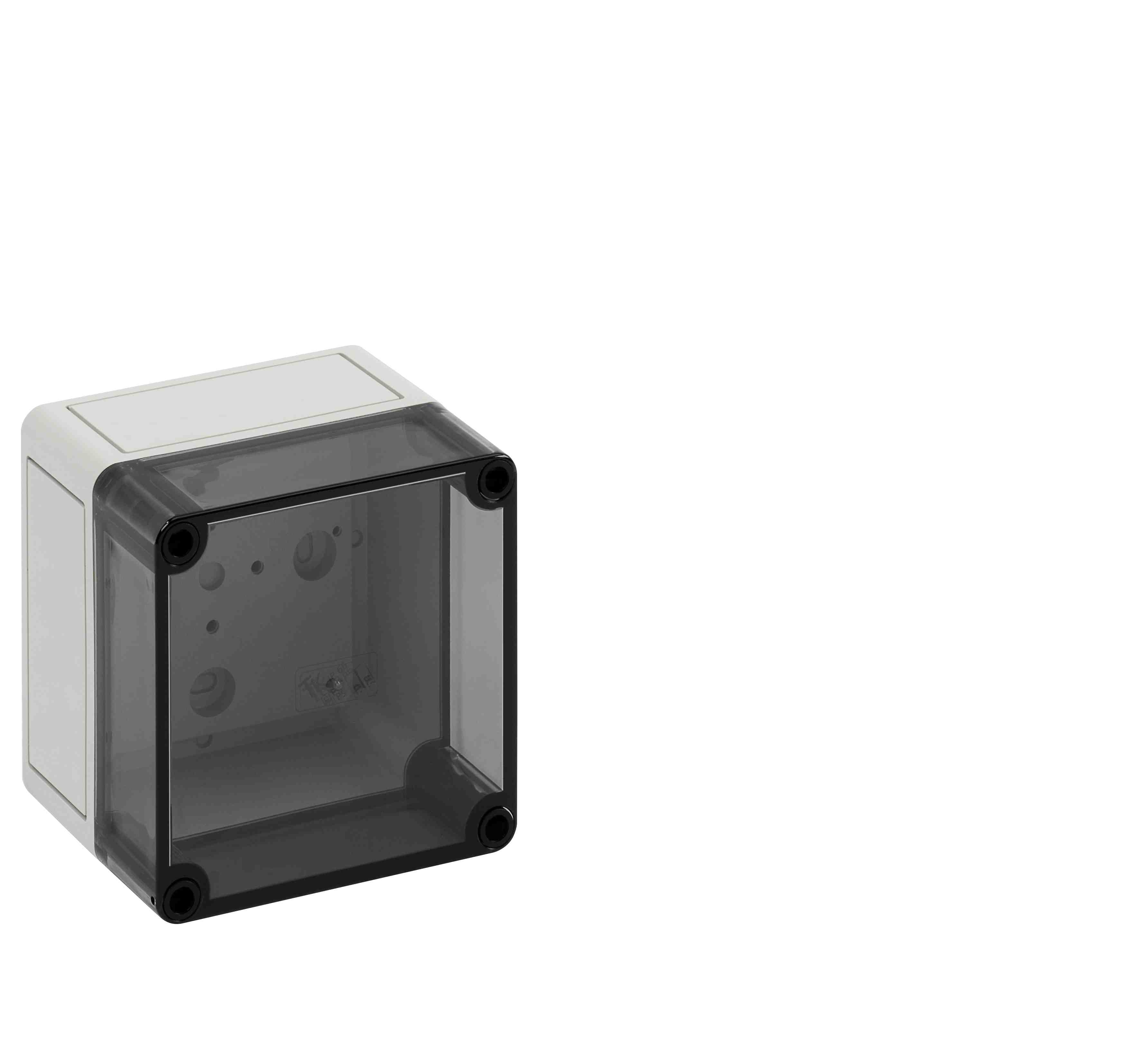 Prázdná skříň, se stupněm krytí IP66, polystyren, Ui=690V AC, Ui=1000V DC, Vnitřní místa pro připevnění, pro standardní instalace ve vnitřním prostoru, Krabice: polystyren, šedá, Víko: polykarbonát, transparenti, hladké boky Rozměry: 110 x 110 x 90 mm