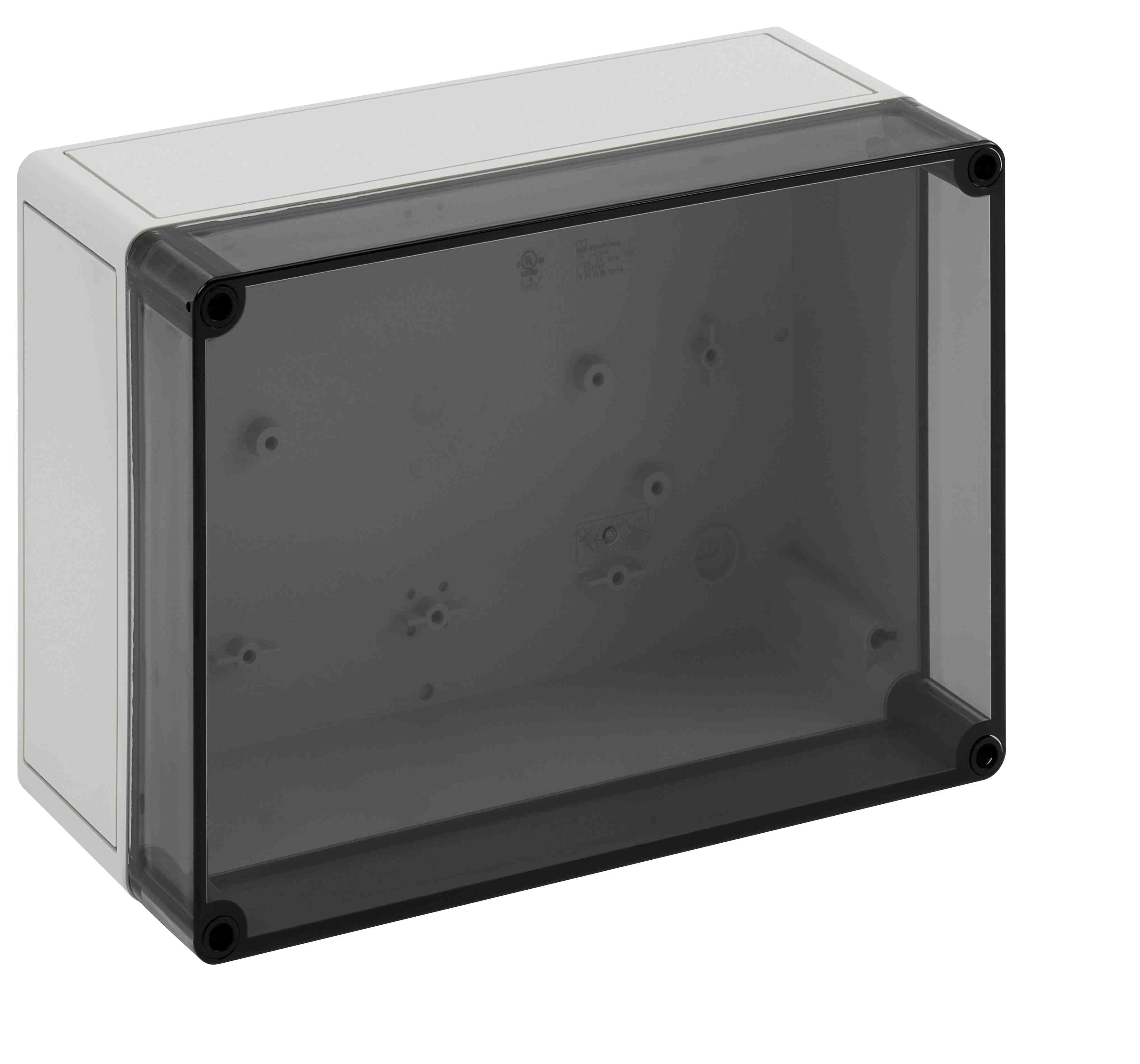 Prázdná skříň, se stupněm krytí IP66, polystyren, Ui=690V AC, Ui=1000V DC, Vnitřní místa pro připevnění, pro standardní instalace ve vnitřním prostoru, Krabice: polystyren, šedá, Víko: polykarbonát, transparenti, hladké boky Rozměry: 254 x 180 x 111 mm