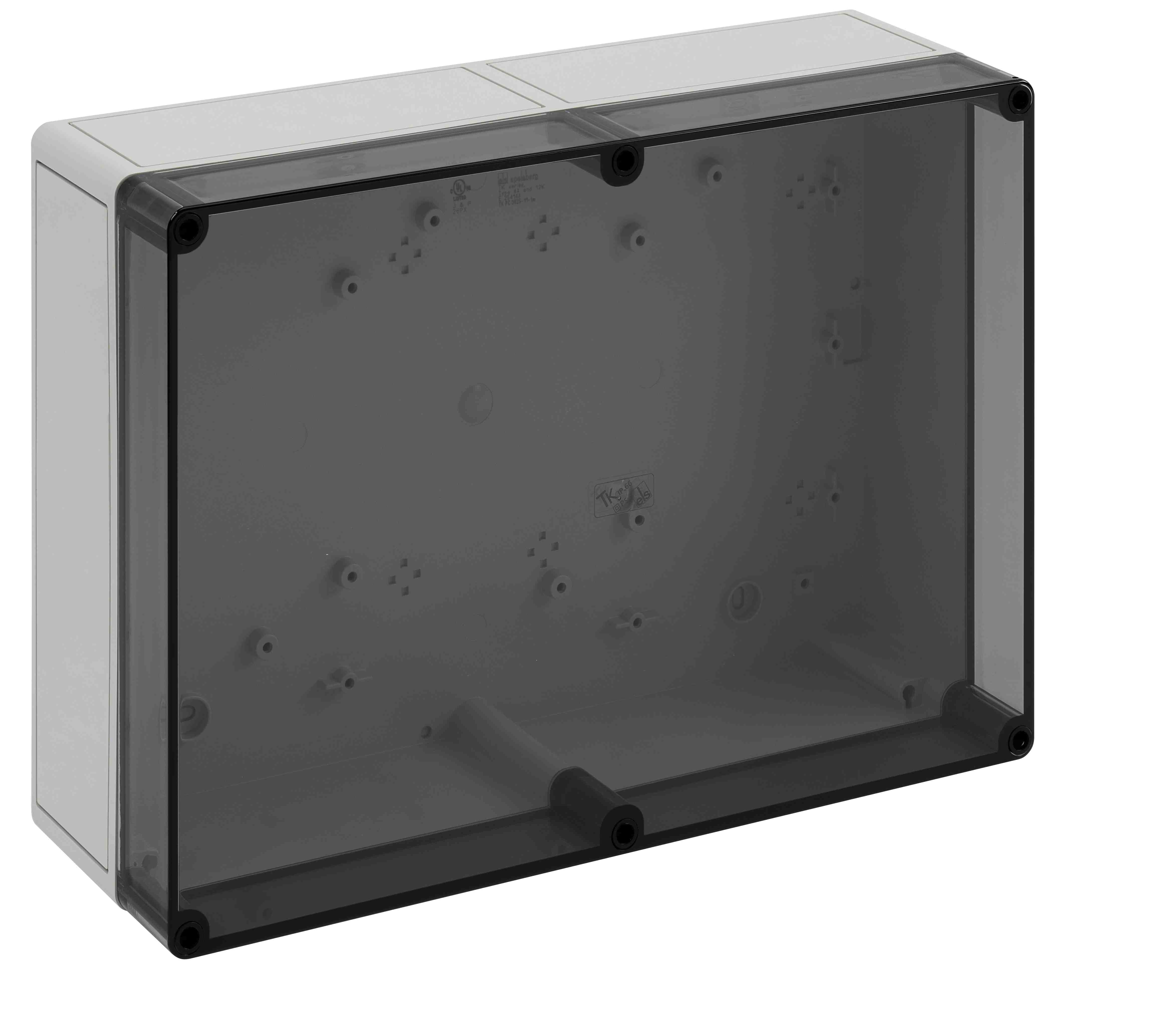 Prázdná skříň, se stupněm krytí IP66, polystyren, Ui=690V AC, Ui=1000V DC, Vnitřní místa pro připevnění, pro standardní instalace ve vnitřním prostoru, Krabice: polystyren, šedá, Víko: polykarbonát, transparenti, hladké boky Rozměry: 361 x 254 x 111 mm