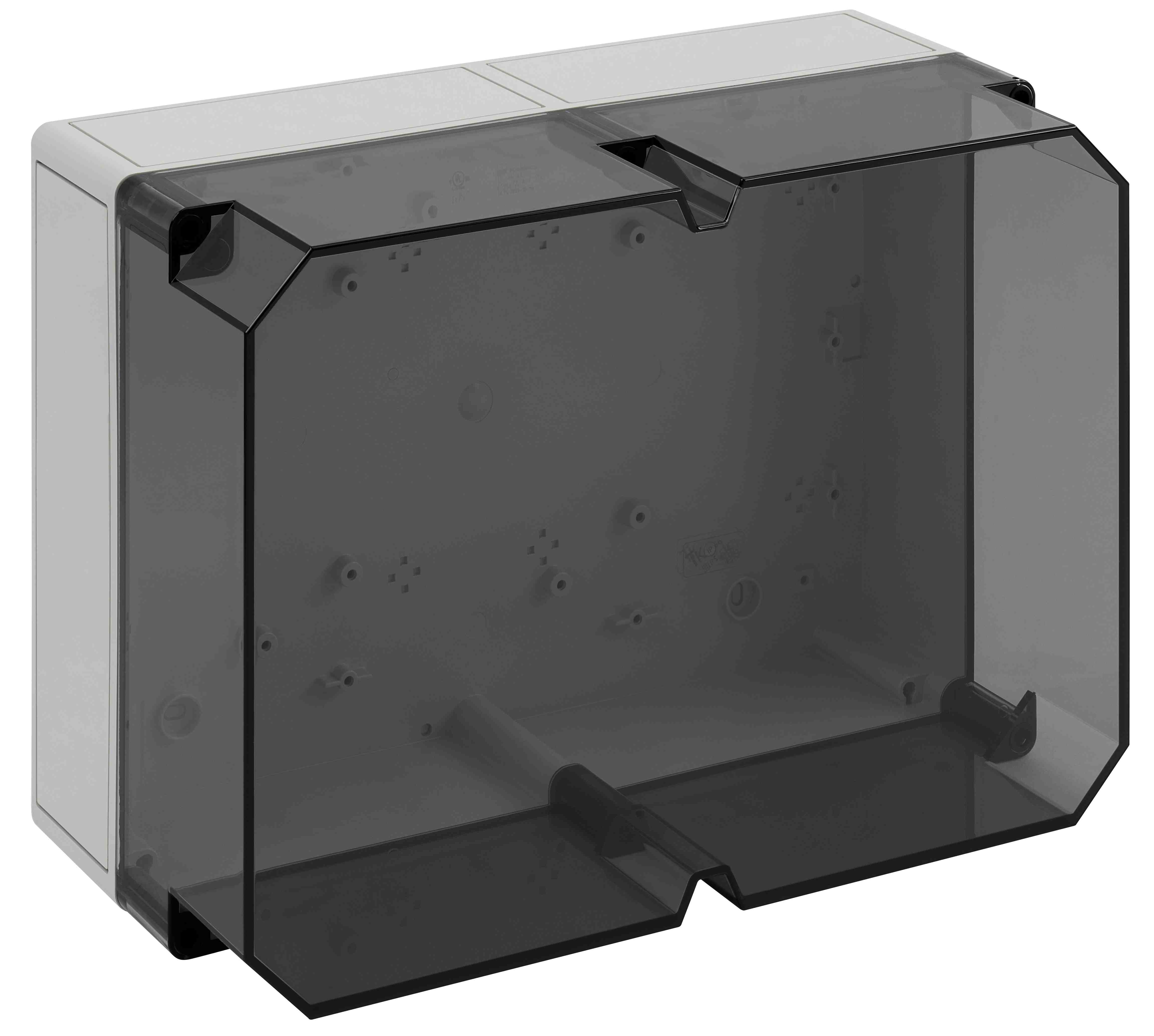 Prázdná skříň, se stupněm krytí IP66, polystyren, Ui=690V AC, Ui=1000V DC, Vnitřní místa pro připevnění, pro standardní instalace ve vnitřním prostoru, Krabice: polystyren, šedá, Víko: polykarbonát, transparenti, hladké boky Rozměry: 361 x 254 x 165 mm