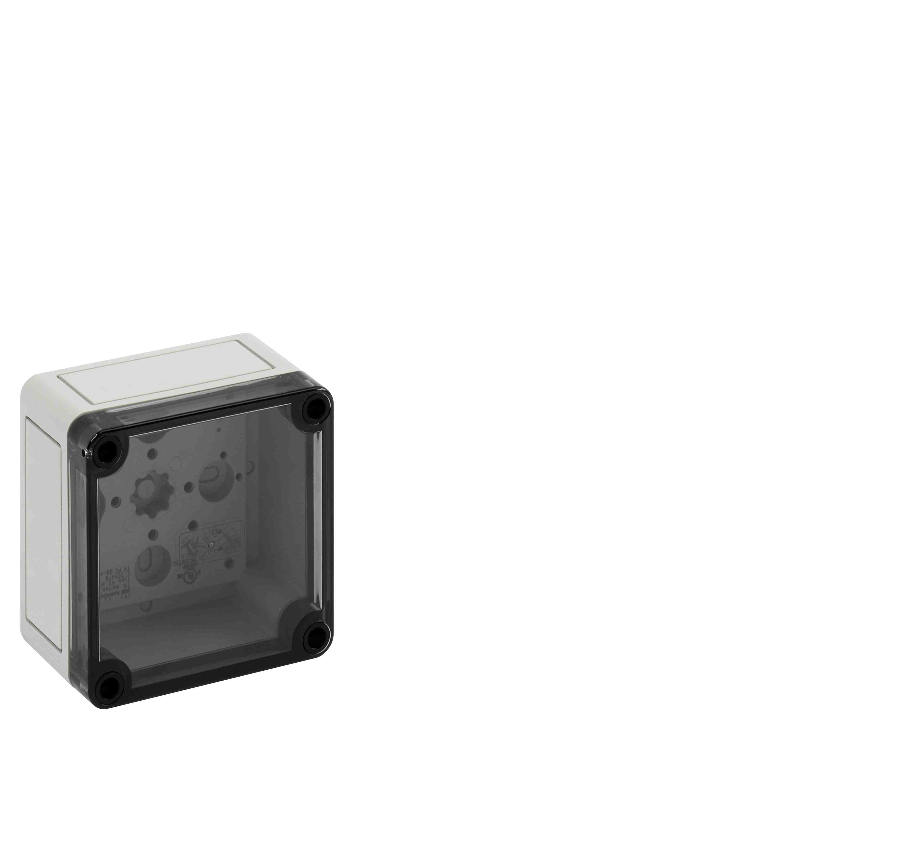 Prázdná skříň, se stupněm krytí IP66, polystyren, Ui=690V AC, Ui=1000V DC, Vnitřní místa pro připevnění, pro standardní instalace ve vnitřním prostoru, Krabice: polystyren, šedá, Víko: polykarbonát, transparenti, hladké boky Rozměry: 94 x 94 x 57 mm