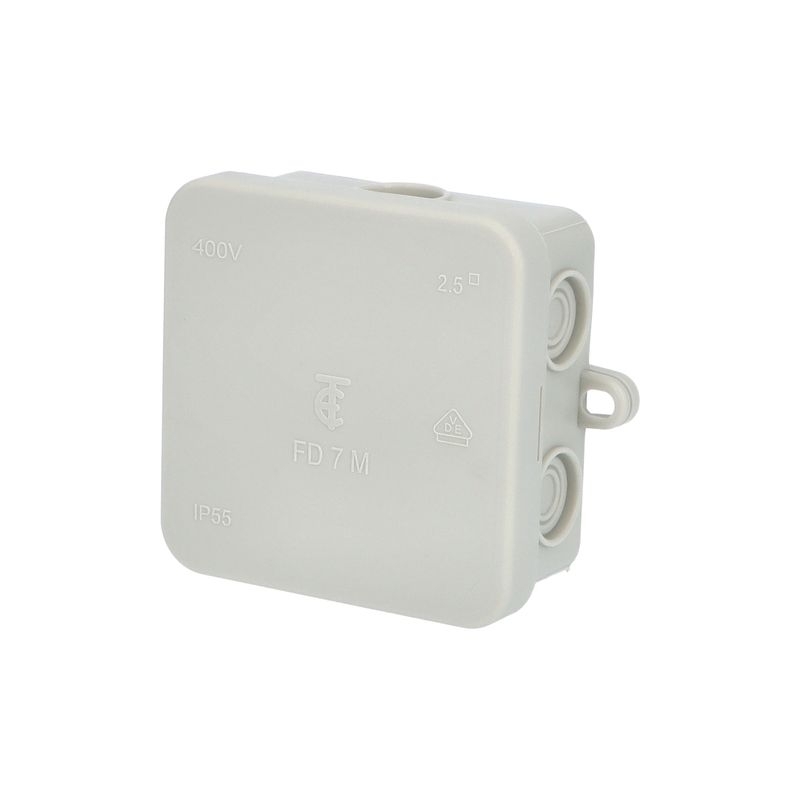 Krabice rozbočovací FD 7 M, plastová, s naklapávacím víčkem, 7x vstup 2,5mm2, na omítku, IP55, 75x75x37mm.