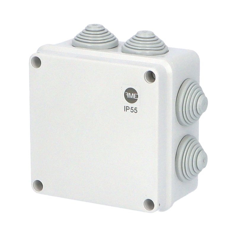 Krabice 68012 IP55 129x129x61mm, montáž na povrch, plné víko, stupňovité vývodky (7x), kovové šrouby.