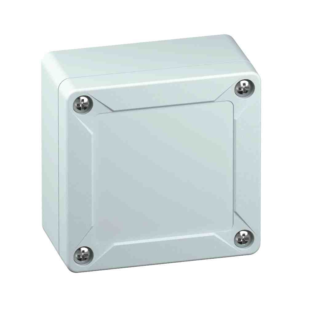Prázdná skříň, se stupněm krytí IP66/IP67, polykarbonát, Certifikováno UL (UL 508 & CSA C22.2 No. 14-13, UL 50 & CSA 22.2 No. 94.1-7 & UL 50E & CSA C22.2 No. 94.2-7), DLG (odolnost vůči čpavku), Ui=690V AC, Ui=1000V DC, Vnitřní místa pro připevnění, pro instalace v průmyslovém prostředí a chráněném venkovním prostředí, s rychlouzávěrem, Krabice: polykarbonát, šedá, Víko: polykarbonát, šedá, hladké boky Rozměry: 84 x 82 x 55 mm Přiložené příslušenství: pojistka proti ztrátě víka, 4 upevňovací šrouby pro příslušenství