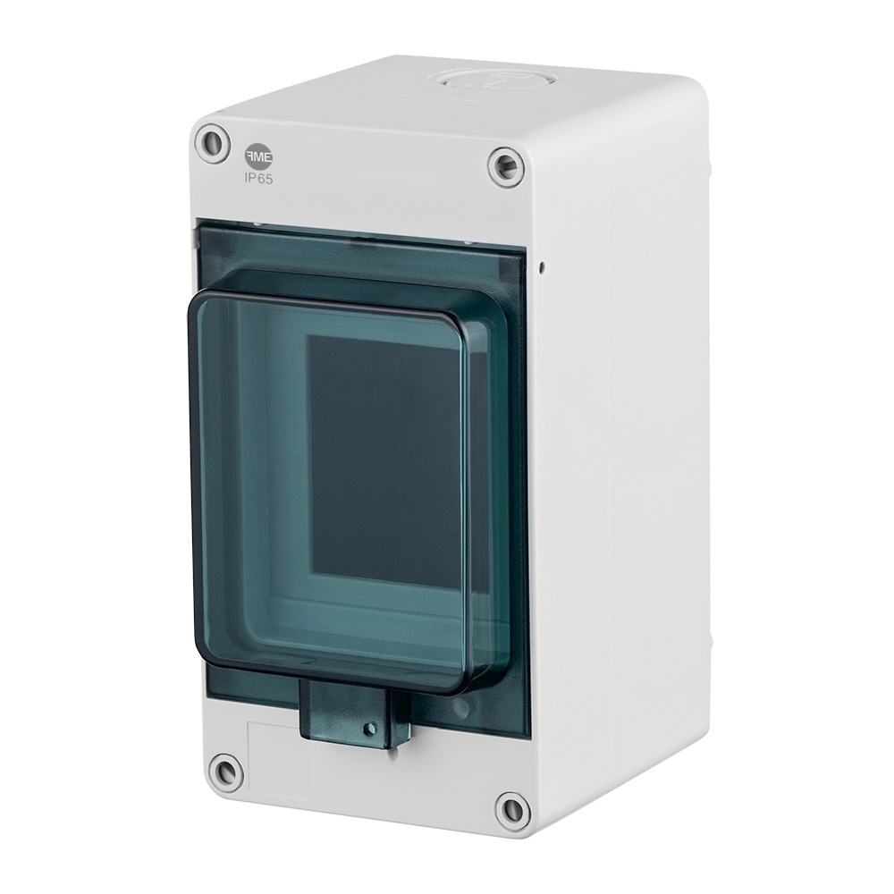 Modulový kryt FlatBOX 5903 ve vyšším krytí IP65, 1x3mod., rozměry: 135x74x97mm, montáž na omítku, průhledné okénko, barva: světle šedá. Bez PE/N svorkovnice.