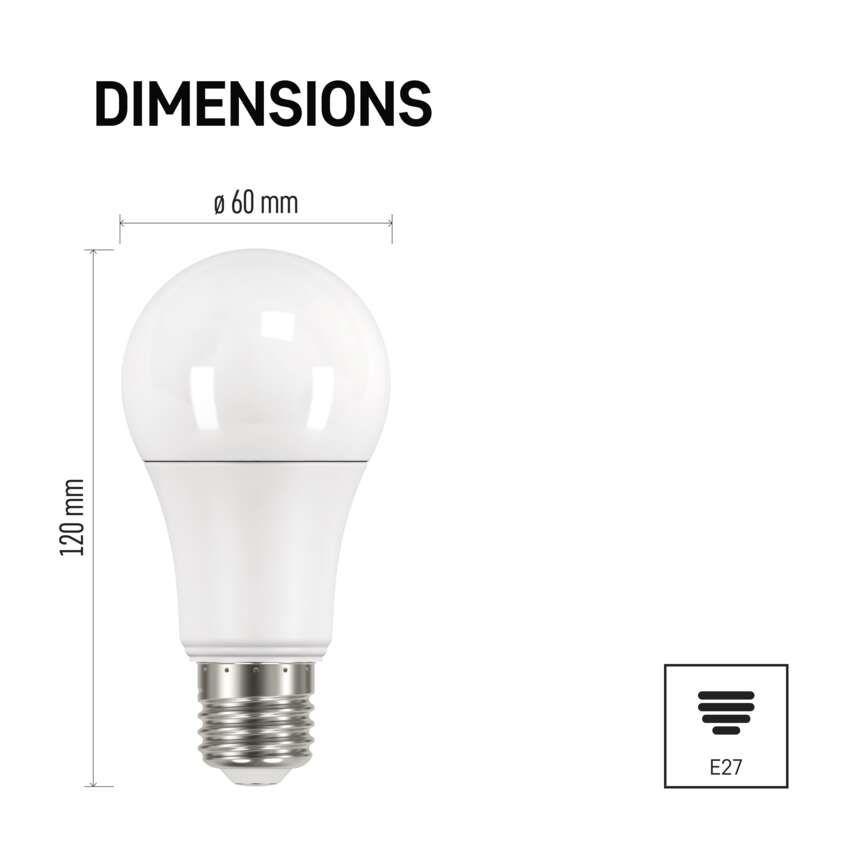 LED žárovka Classic A60 10,7W E27 teplá bílá == barva světla: teplá bílá|energetická třída (od 1.9.2021): F|index podání barev (CRI): 83|náhrada za žárovku: 75 W|napětí: 230 V~/50 Hz|patice (uchycení žárovky): E27|počet čipů: neuvádí se|počet spínacích cyklů: 25 000|příkon: 10,7 W|prodejní obal: 3 ks, krabička|řada: CLASSIC|rozměr: 120 × 60 × 60mm|stmívatelná: ne|světelná účinnost: 99 lm/W|světelný tok: 1 060 lm|technologie: LED|teplota chromatičnosti: 2 700 K|tvar: A60|typ čipů: SMD|účiník: 0,56|úhel vyzařování: 180°|záruční doba: 3 roky|životnost: 30 000 hodin