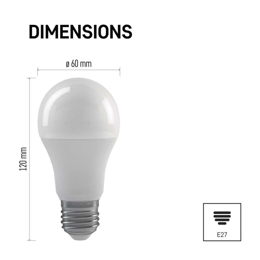 LED žárovka Classic A60 10,5W E27 teplá bílá, stmívatelná == barva světla: teplá bílá|energetická třída (od 1.9.2021): F|index podání barev (CRI): 80|náhrada za žárovku: 75 W|napětí: 230 V~/50 Hz|patice (uchycení žárovky): E27|počet čipů: 4|počet spínacích cyklů: 25 000|příkon: 10,5 W|prodejní obal: 1 ks, krabička|řada: CLASSIC|rozměr: 120 × 60 × 60mm|stmívatelná: ano|světelná účinnost: 101 lm/W|světelný tok: 1 060 lm|technologie: LED|teplota chromatičnosti: 2 700 K|tvar: A60|typ čipů: SMD|účiník: 0,53|úhel vyzařování: 160°|záruční doba: 3 roky|životnost: 30 000 hodin