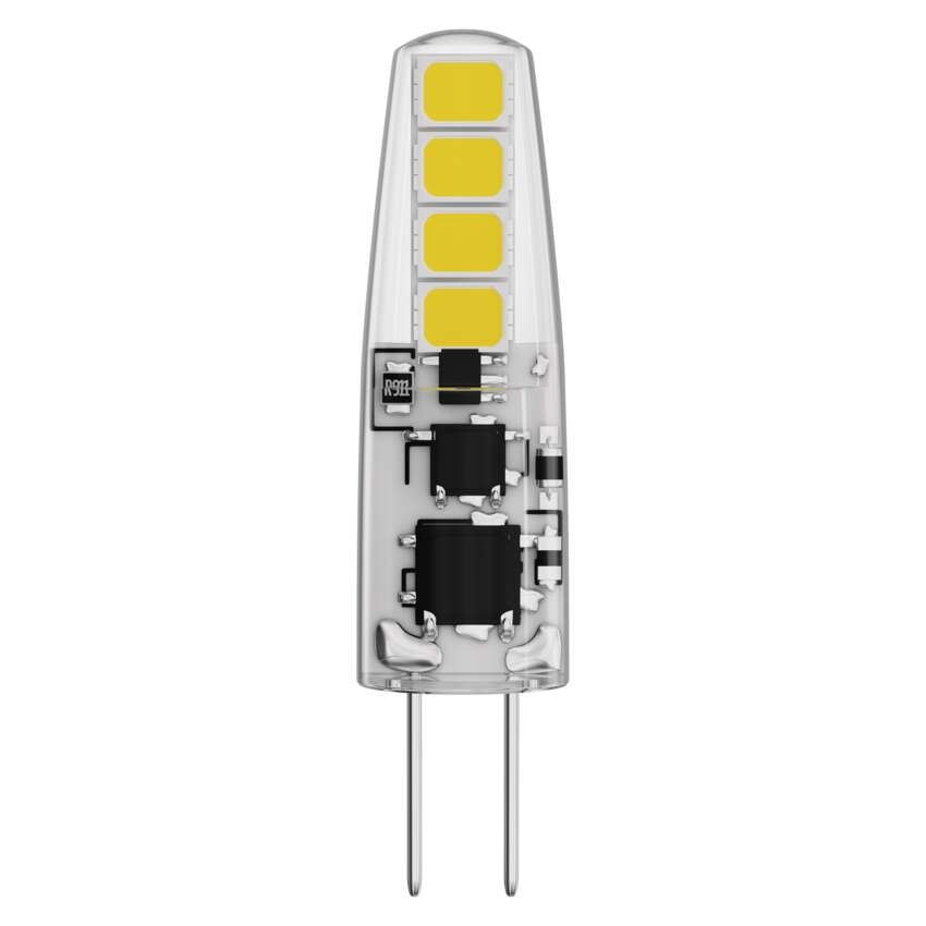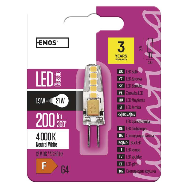 LED žárovka Classic JC 1,9W 12V G4 neutrální bílá == barva světla: neutrální bílá|energetická třída (od 1.9.2021): F|index podání barev (CRI): 80|náhrada za žárovku: 21 W|napětí: 12 V|patice (uchycení žárovky): G4|počet čipů: neuvádí se|počet spínacích cyklů: 25 000|příkon: 1,9 W|prodejní obal: 1 ks, krabička|řada: CLASSIC|rozměr: 36 × 10 × 10mm|stmívatelná: ne|světelná účinnost: 105 lm/W|světelný tok: 200 lm|technologie: LED|teplota chromatičnosti: 4 000 K|tvar: JC|typ čipů: SMD|účiník: 0,69|úhel vyzařování: 300°|záruční doba: 3 roky|životnost: 30 000 hodin