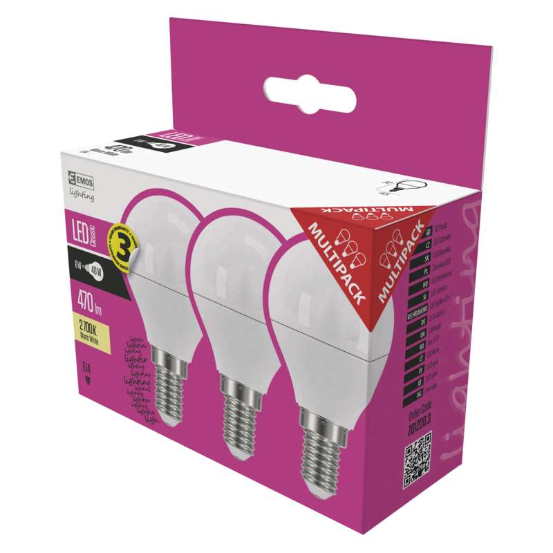 LED žárovka Classic Mini Globe 5W E14 teplá bílá == barva světla: teplá bílá|energetická třída (od 1.9.2021): F|index podání barev (CRI): 80|náhrada za žárovku: 40 W|napětí: 230 V~/50 Hz|patice (uchycení žárovky): E14|počet čipů: 8|počet spínacích cyklů: 25 000|příkon: 5 W|prodejní obal: 3 ks, krabička|řada: CLASSIC|rozměr: 45 × 78 mm|stmívatelná: ne|světelná účinnost: 78 lm/W|světelný tok: 470 lm|technologie: LED|teplota chromatičnosti: 2 700 K|tvar: Mini Globe|typ čipů: 2835|účiník: 0,5|úhel vyzařování: 220°|záruční doba: 3 roky|životnost: 30 000 hodin
