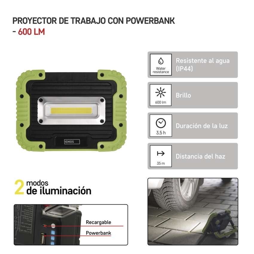 COB LED nabíjecí pracovní reflektor P4534, 600 lm, 3000 mAh == barva: černo-zelená|baterie součástí balení: ano|doba nabíjení: 3,5 h|doba svícení: 2,5–3,5 h|doba svícení detail: COB LED 100 % – 2,5 h, COB LED 50 % – 3,5 h|dosvit: COB LED 100 % – 35 m, COB LED 50 % – 25 m|fokus: ne|hmotnost: 436 g|LED indikace nabíjení: ano|LED indikace stavu akumulátoru: ano|materiál: Nylon + TPR|maximální dosvit: 35 m|maximální světelný tok: 600 lm|nabíjecí: ano|napájení: Li-Ion akupack|nárazuvzdornost: ano|počet režimů svícení: 2|příslušenství: USB kabel|prodejní obal: 1 ks, krabice|režimy svícení: COB LED 100 %, COB LED 50 %|rozměr: 172 × 45 × 126 mm|speciální funkce: funkce ochrany baterie, funkce power bank|světelný tok: COB LED 100 % – 600 lm, COB LED 50 % – 300 lm|typ baterie: 3 000 mAh/3,7 V|typ napájecího konektoru: micro USB B|voděodolnost: ano (IP44)|vybavení: otočná rukojeť|záruční doba: 2 roky|zdroj světla: COB LED|značka: EMOS