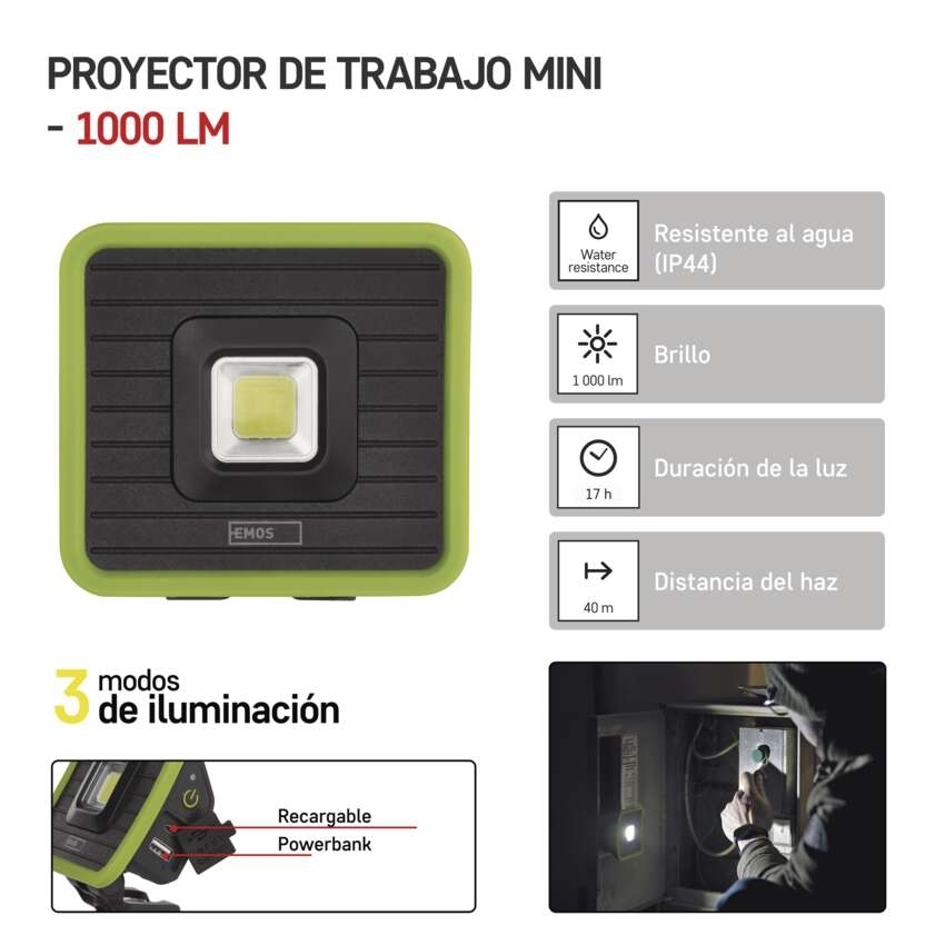LED nabíjecí pracovní reflektor P4539, 1000 lm == barva: černo-zelená|baterie součástí balení: ano|doba nabíjení: 3 h|doba svícení: 3–17 h|doba svícení detail: COB LED 100 % – 3 h, COB LED 50 % – 6 h, COB LED 25 % – 17 h|dosvit: COB LED 100 % – 40 m, COB LED 50 % – 30 m, COB LED 25 % – 20 m|fokus: ne|hmotnost: neuvádí se|LED indikace nabíjení: ano|LED indikace stavu akumulátoru: ne|materiál: ABS plast|maximální dosvit: 40 m|maximální světelný tok: 1 000 lm|nabíjecí: ano|napájení: Li-Ion|nárazuvzdornost: ano|počet režimů svícení: 3|příslušenství: USB-C kabel|prodejní obal: 1 ks, krabice|režimy svícení: COB LED 100 %, COB LED 50 %, COB LED 25 %|rozměr: 104 × 39 × 94 mm|speciální funkce: funkce power bank, funkce rychlého vypnutí, funkce ochrany baterie|světelný tok: COB LED 100 % – 1 000 lm, COB LED 50 % – 500 lm, COB LED 25 % – 250 lm|typ baterie: 2 200 mAh/3,7 V|typ napájecího konektoru: USB C|voděodolnost: ano (IP44)|vybavení: magnet, otočný stojánek, klip|záruční doba: 2 roky|zdroj světla: COB LED|značka: EMOS