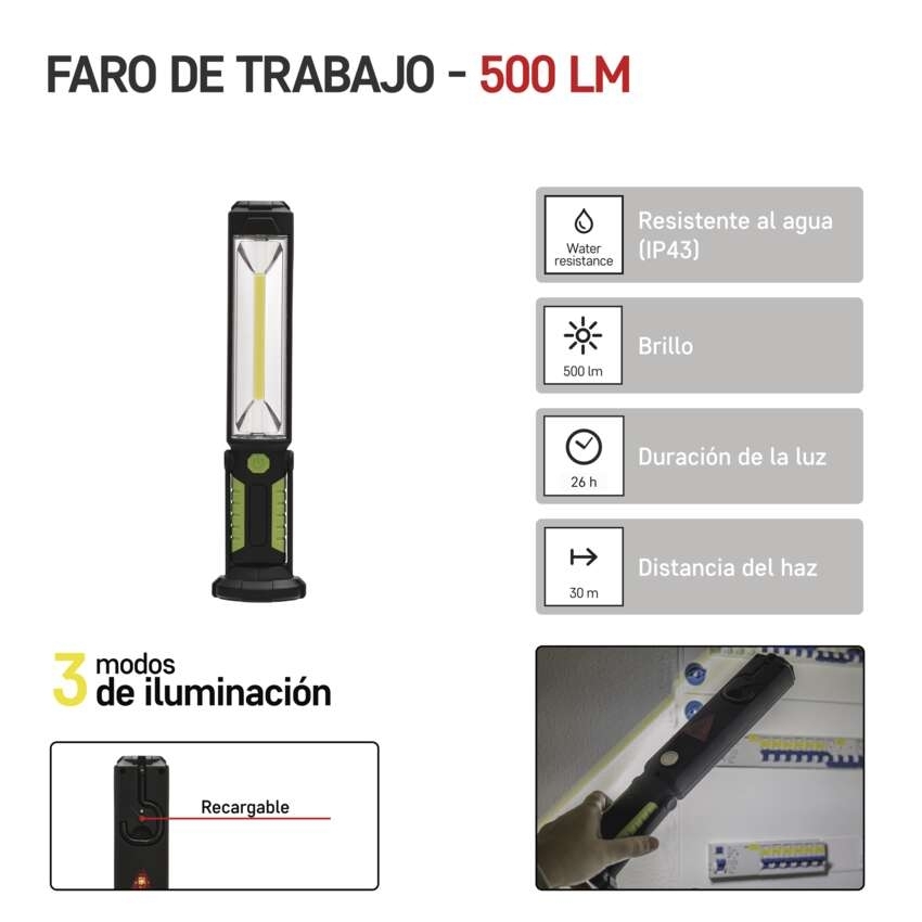 COB LED + LED pracovní svítilna P4525,500 lm,Li-Ion 2000 mAh == barva: zeleno-černá|baterie součástí balení: ano|doba nabíjení: 3 h|doba svícení: 2–26 h|doba svícení detail: COB LED 50 % – 4 h, COB LED 100 % – 2 h, 5× LED 26 h|dosvit: COB LED 50 % – 22 m, COB LED 100 % – 30 m, 5× LED 24 m|fokus: ne|hmotnost: 537 g|LED indikace nabíjení: ano|LED indikace stavu akumulátoru: ne|materiál: ABS plast + guma|maximální dosvit: 30 m|maximální světelný tok: 500 lm|nabíjecí: ano|napájení: Li-Ion akupack|nárazuvzdornost: ano|počet režimů svícení: 3|příslušenství: napájecí adaptér + adaptér do automobilu|prodejní obal: 1 ks, krabice|režimy svícení: COB LED 50 %, COB LED 100 %, 5× LED|rozměr: 76 × 66 × 317 mm|speciální funkce: funkce rychlého vypnutí, funkce ochrany baterie|světelný tok: COB LED 50 % – 270 lm, COB LED 100 % – 500 lm, 5× LED 15 lm|typ baterie: 2 000 mAh/3,7 V|typ napájecího konektoru: 3,0 × 1,0/12 mm|voděodolnost: ano (IP43)|vybavení: naklápěcí rukojeť, 1× hák, 3× magnet|záruční doba: 2 roky|zdroj světla: COB LED + 5× LED|značka: EMOS