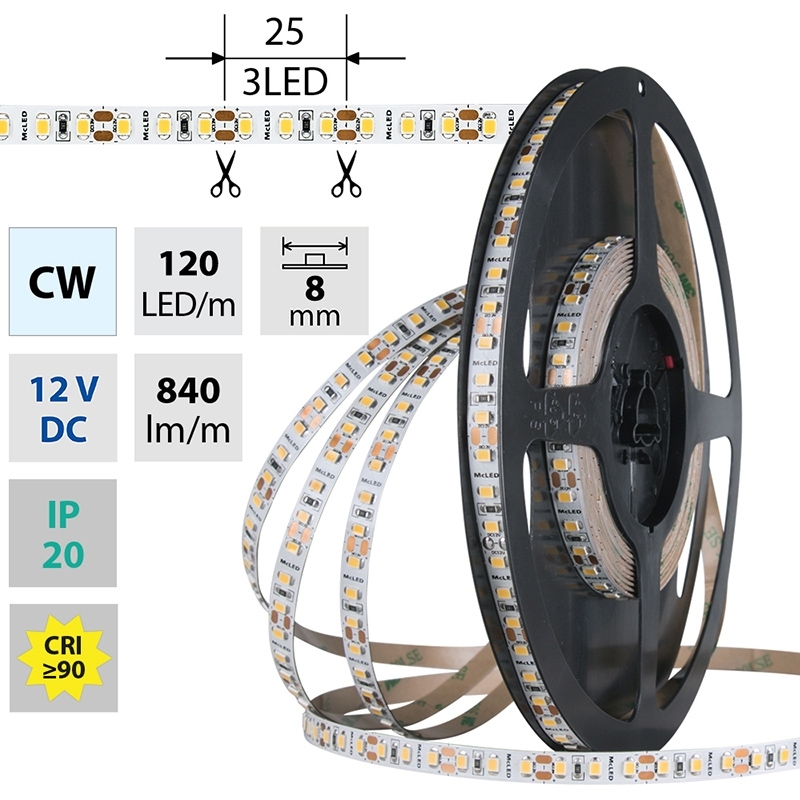 LED pásek SMD2835 CW, 120LED/m, 9,6W/m, DC 12V, 840lm/m, CRI90, IP20, 8mm, 5m *ML-121.838.