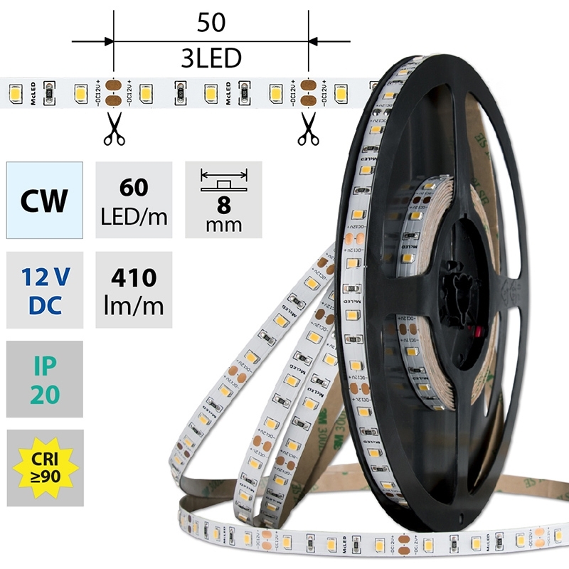 LED pásek SMD2835 CW, 60LED/m, 4,8W/m, DC 12V, 410lm/m, CRI90, IP20, 8mm, 5m *ML-121.829.6