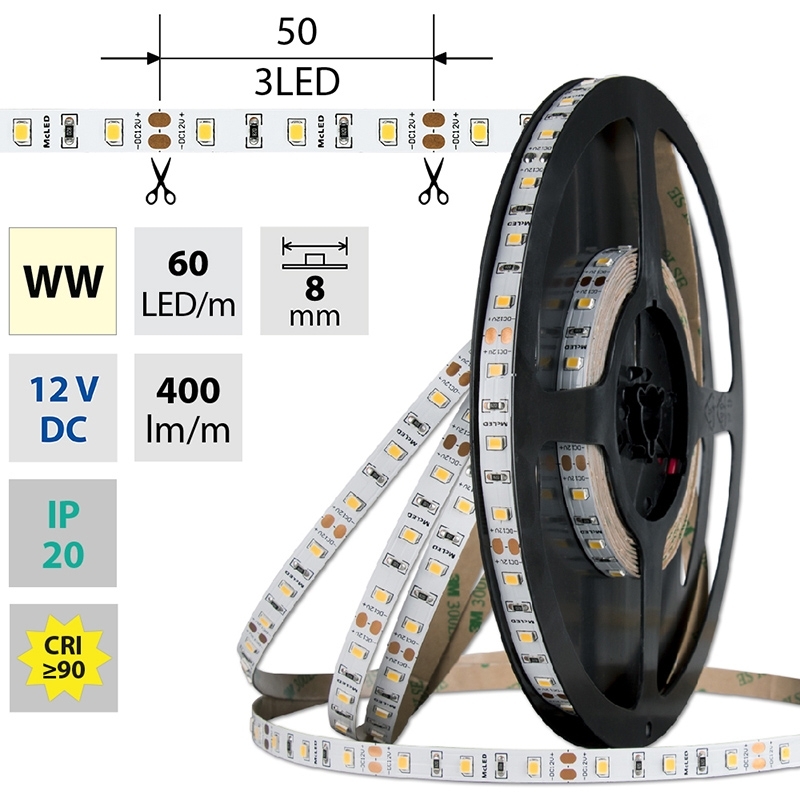 LED pásek SMD2835 WW, 60LED/m, 4,8W/m, DC 12V, 400lm/m, CRI90, IP20, 8mm, 5m *ML-121.831.6