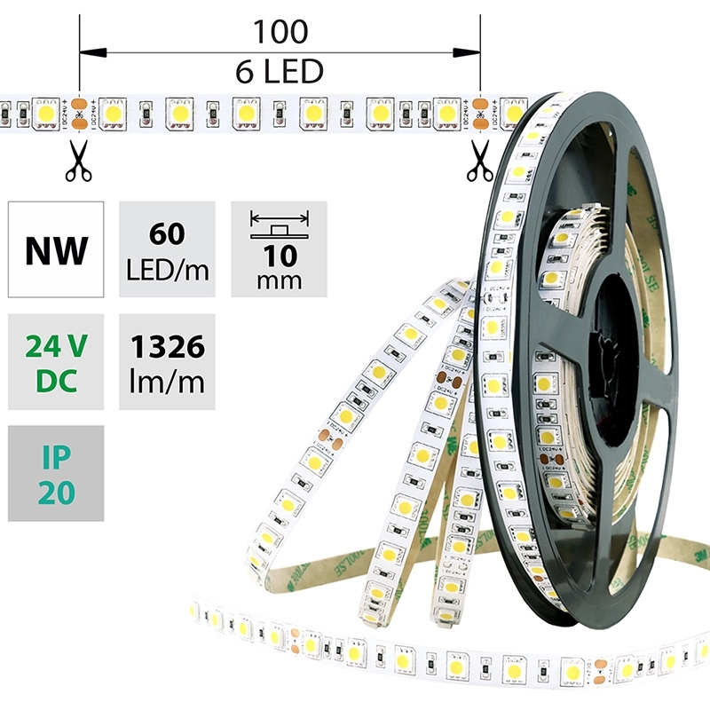LED pásek SMD5050 NW, 60LED/m, 14,4W/m, 1296lm/m, IP20, DC 24V, 10mm, ML-126.665.60.2 McLED