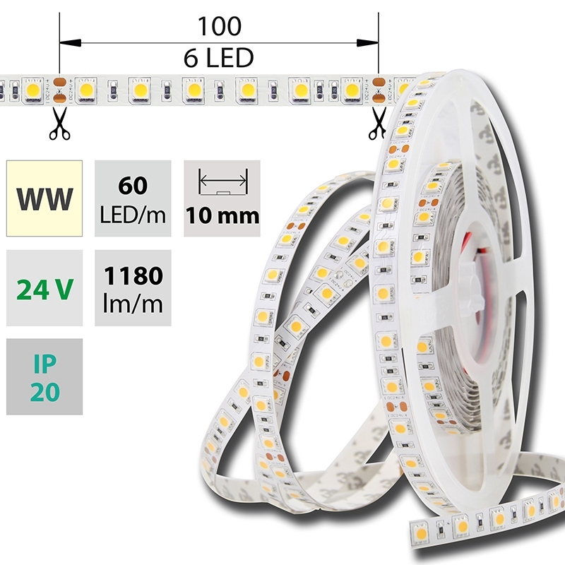 LED pásek SMD5050 teple bílá, DC24V, IP20, 10mm,bílý PCB pásek, 60 LED/m *ML-126.600.60.0