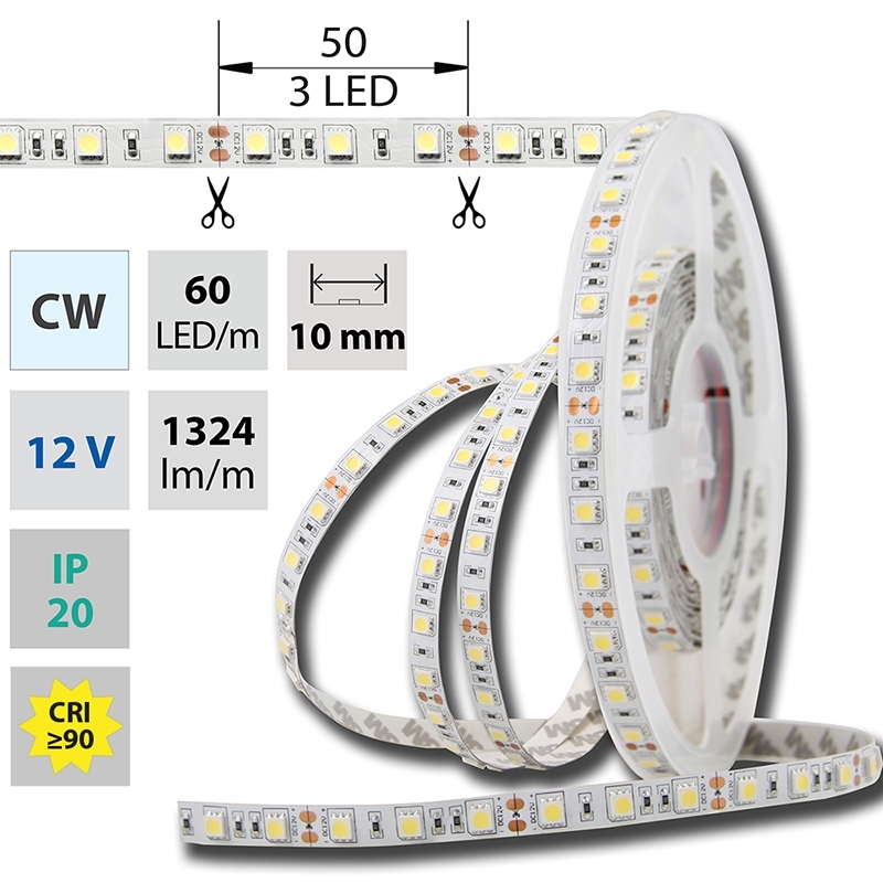 LED pásek SMD5050 bílá, DC12V, IP20, 10mm, bílý PCB pásek, 60 led/metr ML-121.599.60.0
