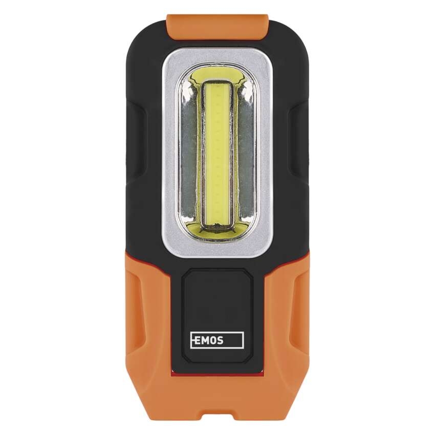 COB LED pracovní svítilna P3888, 180 lm, 3× AAA == barva: černo-oranžová|baterie součástí balení: ne|doba nabíjení: neuvádí se|doba svícení: 16–24 h|doba svícení detail: COB LED 100 % – 16 h, COB LED 50 % – 24 h|dosvit: COB LED 100 % – 45 m, COB LED 50 % – 25 m|fokus: ne|hmotnost: 110 g|LED indikace nabíjení: neuvádí se|LED indikace stavu akumulátoru: neuvádí se|materiál: ABS plast|maximální dosvit: 45 m|maximální světelný tok: 180 lm|nabíjecí: ne|napájení: 3× AAA|nárazuvzdornost: ano|počet režimů svícení: 2|příslušenství: neuvádí se|prodejní obal: 1 ks, blistr|režimy svícení: COB LED 100 %, COB LED 50 %|rozměr: 59 × 30 × 133 mm|speciální funkce: neuvádí se|světelný tok: COB LED 100 % – 180 lm, COB LED 50 % – 60 lm|typ baterie: LR03 (1,5 V)|typ napájecího konektoru: neuvádí se|voděodolnost: ne|vybavení: lámací rukojeť, 1× hák, 2× magnet|záruční doba: 2 roky|zdroj světla: COB LED|značka: EMOS