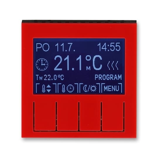 Termostat univerzální programovatelný (ovládací jednotka); červená/kouř. černá Vhodné pro designy z vypínačových řad ABB : H Objednací číslo : 3292H-A10301 65