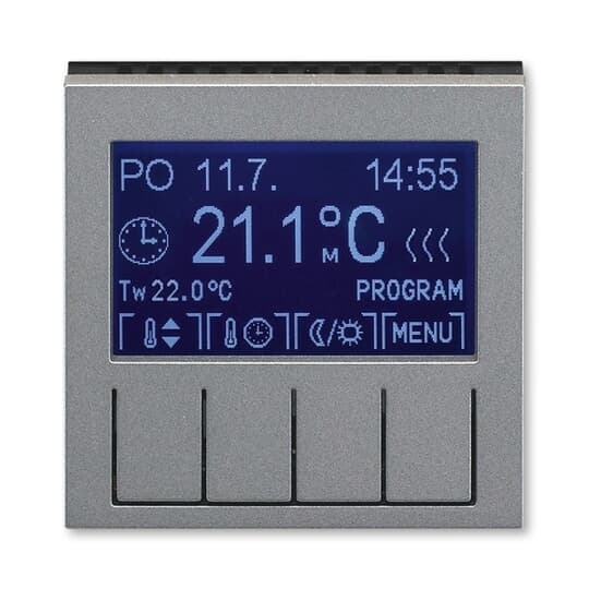 Termostat univerzální programovatelný (ovládací jednotka); ocelová/kouř. černá   Vhodné pro designy z vypínačových řad ABB : HM   Objednací číslo : 3292H-A10301 69