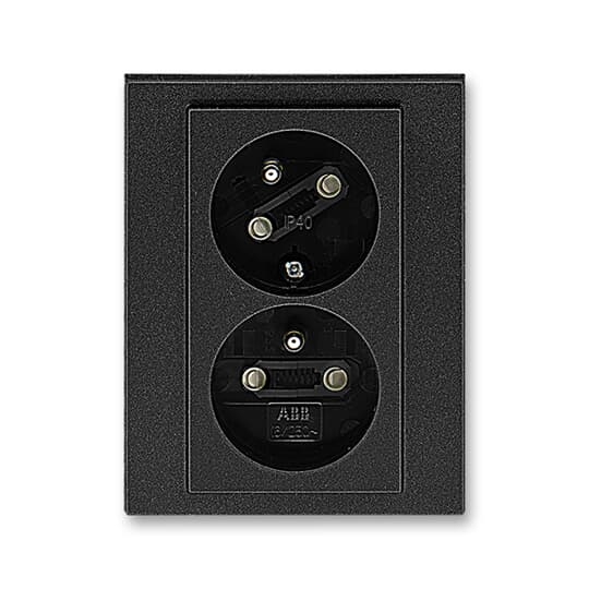 Zásuvka dvojnásobná s ochr. kolíky, s clonkami, s natočenou dutinou; onyx/kouřová černá Vhodné pro designy z vypínačových řad ABB : HM Objednací číslo : 5513H-C02357 63