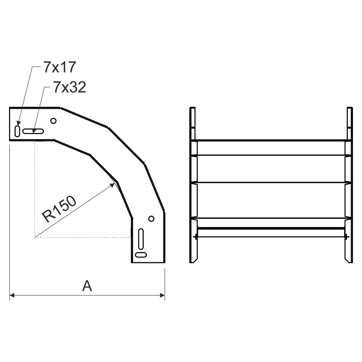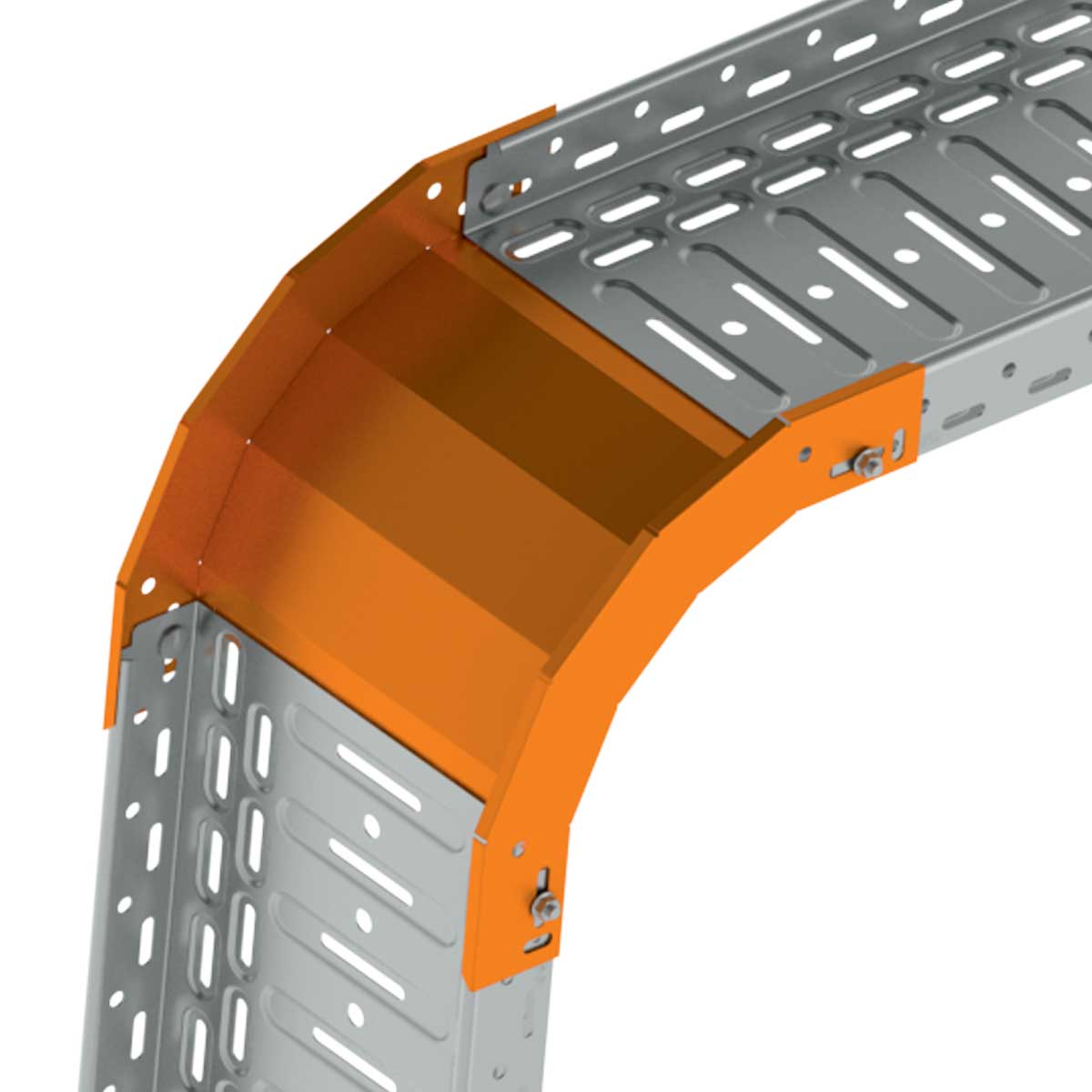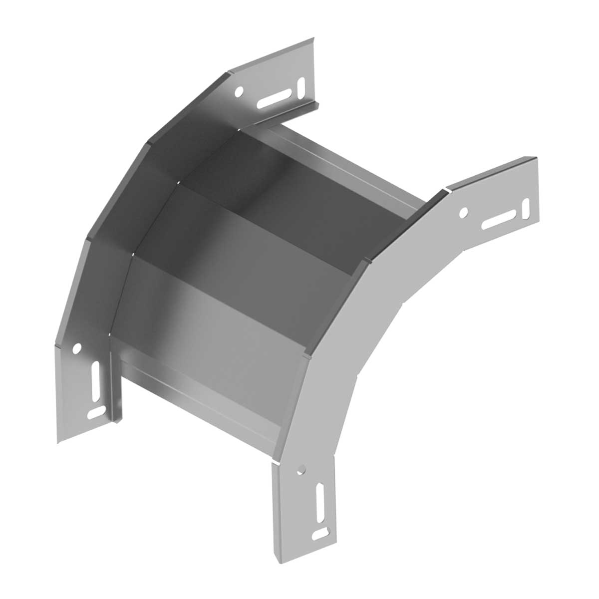 Klesající oblouk pro kabelové trasy rozměru 100x125, povrchová úprava žárový zinek, spojení s kabelovými žlaby je bez použití spojek, slouží k vytvoření klesání trasy pod úhlem 90°
