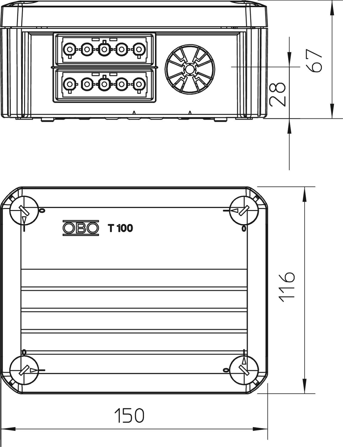 OBO T 100 WB 2s5 Odbočné krabice, se zásuvkami Wieland 2s5p, 150x116x67, světle šedá Polypropylén, PP *2007852