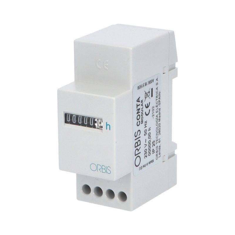 Počítadlo provozních hodin ORBIS CONTA MODULAR - napětí 230V (50Hz), 2modulové, velikost číslic 4,4mm, kapacita hodin 99999, montáž na DIN lištu, krytí IP25, barva šedá.