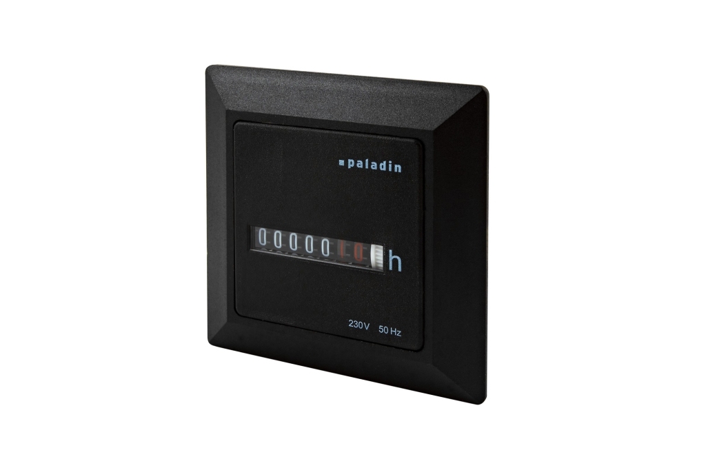 Počítadlo provozních hodin PALADIN BW 40.38 - napětí 230V (50Hz), velikost číslic 4,4mm, kapacita hodin 99999, montáž na panel, s rámečkem 72x72mm, krytí IP50, barva černá.
