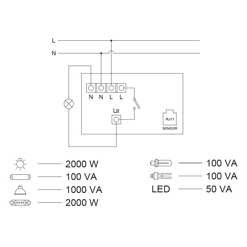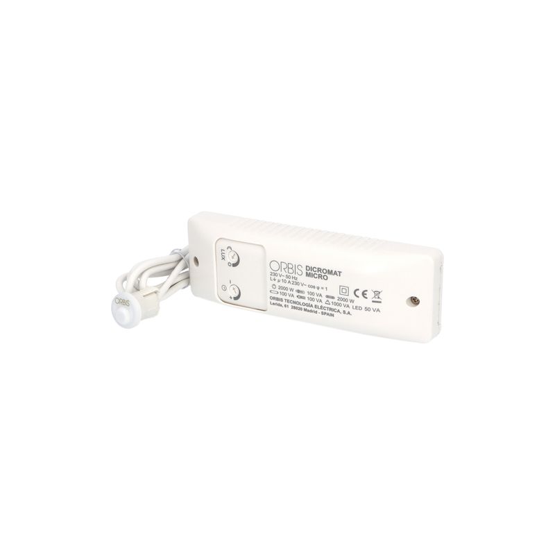 Pohybové čidlo ORBIS DICROMAT MICRO - nastavení intenzity světla 5-3000lux, proudové zatížení 10 A, jmenovité napětí 230 V, krytí IP20, úhel snímání 360°.