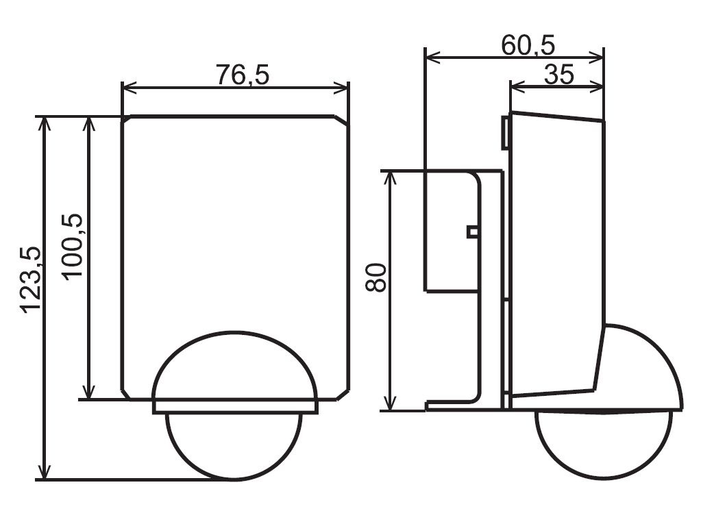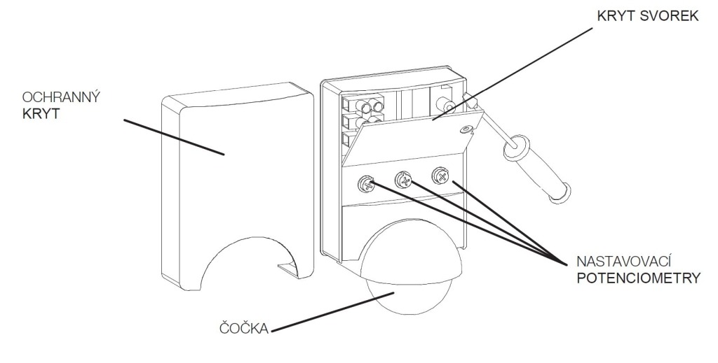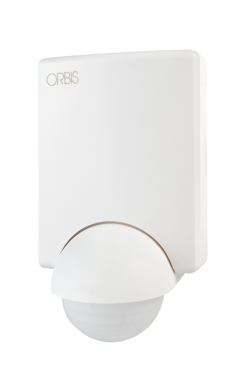 Pohybové čidlo ORBIS PROXIMAT, nastavení intenzity světla 5-2000lux, proudové zatížení 10 (2,5) A, jmenovité napětí 230 V, krytí IP45, úhel snímání 240°.