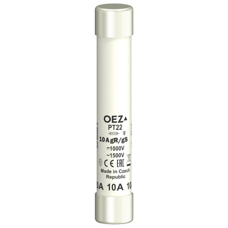 Pojistková vložka PT22 10A gR/gS Un AC 1500 V / DC 1000 V, velikost 22x127, gR - charakteristika pro jištění polovodičů, gS - charakteristika pro jištění polovodičů a kabelů, Cd/Pb free OEZ:08340
