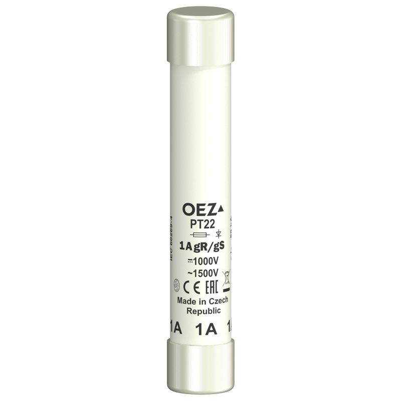 Pojistková vložka PT22 1A gR/gS Un AC 1500 V / DC 1000 V, velikost 22x127, gR - charakteristika pro jištění polovodičů, gS - charakteristika pro jištění polovodičů a kabelů, Cd/Pb free OEZ:08601