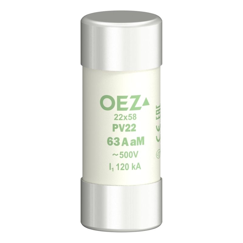 Pojistková vložka PV22 63A aM Un AC 500 V / DC 250 V, velikost 22×58, aM - charakteristika motorová pouze proti zkratu, Cd/Pb free OEZ:06753