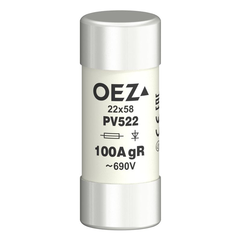 Pojistková vložka PV522 100A gR Un AC 690 V / DC 250 V, velikost 22x58, gR - charakteristika pro jištění polovodičů, Cd/Pb free OEZ:13796