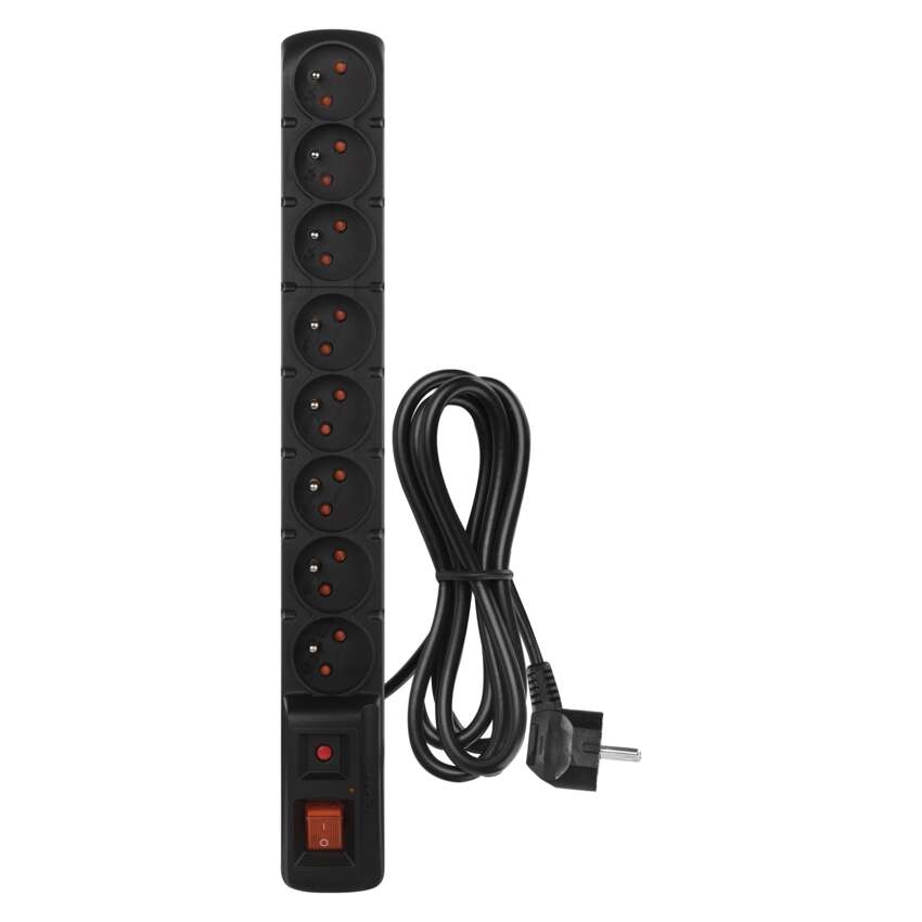 Přepěťová ochrana – 8 zásuvek, 1,5m, černá == absorpce energie: 150 J|anténní (koaxiální ochrana): ne|barva: černá|délka: 1,5 m|dětské clonky: ano|doba odezvy: <25 ns|EMI/RFI filtr: ne|garance: 2 000 €|indikátor přepětí: ano|indikátor zapojení: ne|jištení: pojistka s čas. zpož. 10 A/250 V|jmenovité napětí: 250 V~, 50 Hz|max. proudová zátěž: 10 A max.|max. zátěž: 2 300 W|ochrana proti přetížení: ano|ochranná úroveň Up: 1,3 kV (L/N)|počet zásuvek: 8× 2P + PE|prodejní obal: 1 ks, krabice|rozměr: 445 × 54 × 55 mm|rozsah kmitočtu: neuvádí se|tel. / fax / DSL ochrana: ne|USB výstup: ne|útlum: neuvádí se|vodič: H05VV-F3G 1,0 mm?|zkušební vlna U0c: 4 kV