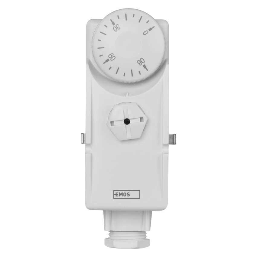 Příložný termostat EMOS P5681 == barva: bílá|délka kapilárového čidla: neuvádí se|dosah ve volném prostoru: neuvádí se|druh regulace: vytápěcí a chladící systém|funkce ON/OFF: ne|funkce prázdniny: ne|funkce Set-back: neuvádí se|kalibrace teploty: ne|měření teploty: 0 °C až 90 °C|možnost propojení s dalšími detektory: neuvádí se|napájení: 230 V, 400 V AC|napájení brány: neuvádí se|napájení přijímače: neuvádí se|napájení vysílače: neuvádí se|nastavení teploty: 0 °C až 90 °C, rozlišení 5 °C|nastavitelný rozptyl teploty: neuvádí se|ochrana proti zamrznutí: ne|počet programů: neuvádí se|podsvícený displej: neuvádí se|pracovní frekvence: neuvádí se|prodejní obal: 1 ks, krabička|rozměr: 38 × 54 × 105 mm|rozměr brány: neuvádí se|rozměr přijímače: neuvádí se|rozměr vysílače: neuvádí se|součást balení: neuvádí se|spínaná zátěž: 16 A odporově, 4 A induktivně|spínání: napěťové 230 V AC, 50 Hz|typ nastavení teploty: neuvádí se|typ ovládání: manuální termostat|typ termostatu: drátový příložný