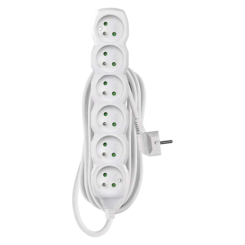 Prodlužovací kabel – 6 zásuvek, 5m, bílý == barva: bílá|délka: 5 m|dětské clonky: ano|krytí: IP20|materiál zásuvky a vidlice: plast|max. zátěž: 3 680 W|napětí: 250 V~|počet zásuvek: 6|prodejní obal: 1 ks, závěs|proud: 16 A max.|průřez vodiče: 1,5 mm?|typ izolace: PVC|USB výstup: ne|vodič: H05VV-F3G|vypínač: ne