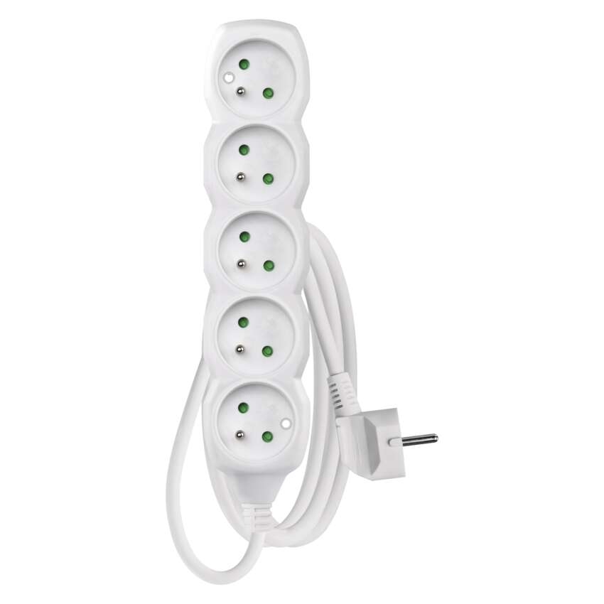 Prodlužovací kabel 1,5 m / 5 zásuvek / bílý / PVC / 1 mm2 == barva: bílá|délka: 1,5 m|dětské clonky: ano|krytí: IP20|materiál zásuvky a vidlice: plast|max. zátěž: 2 300 W|napětí: 250 V~|počet zásuvek: 5|prodejní obal: 1 ks, závěs|proud: 10 A max.|průřez vodiče: 1,0 mm?|typ izolace: PVC|USB výstup: ne|vodič: H05VV-F3G|vypínač: ne